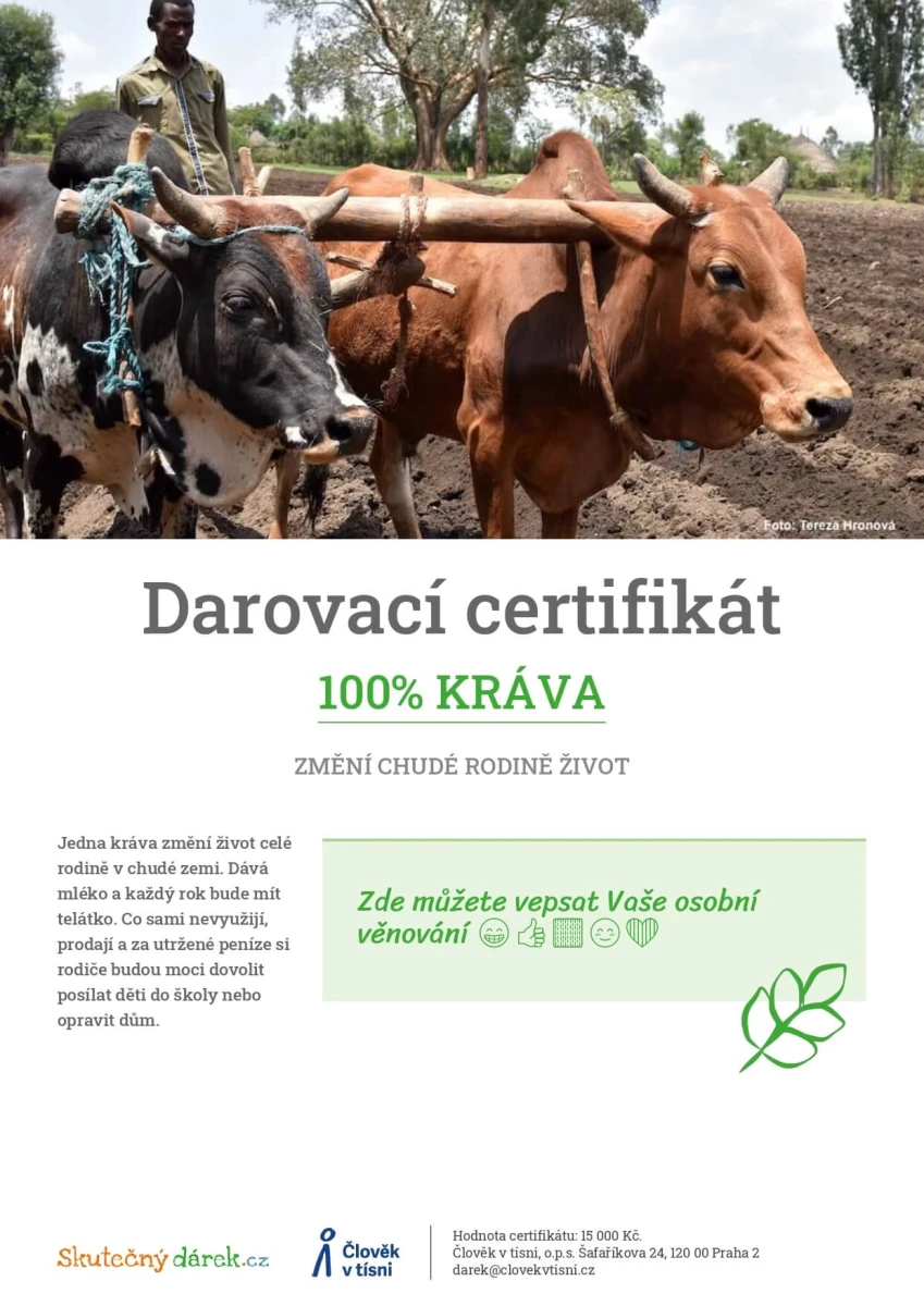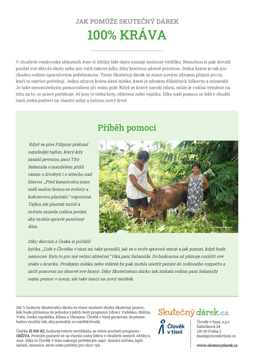 Jedna živá a zdravá kráva dokáže chudé rodině změnit život. Každý rok může mít telátko a dávat čerstvé mléko. To si rodina nechá, nebo prodá – za utržené peníze si rodiče budou moci dovolit poslat děti do školy nebo opravit dům. Jen jednou krávou darujete lidem lepší živobytí a sobě radost, že se někomu na druhé straně světa díky vám daří lépe.