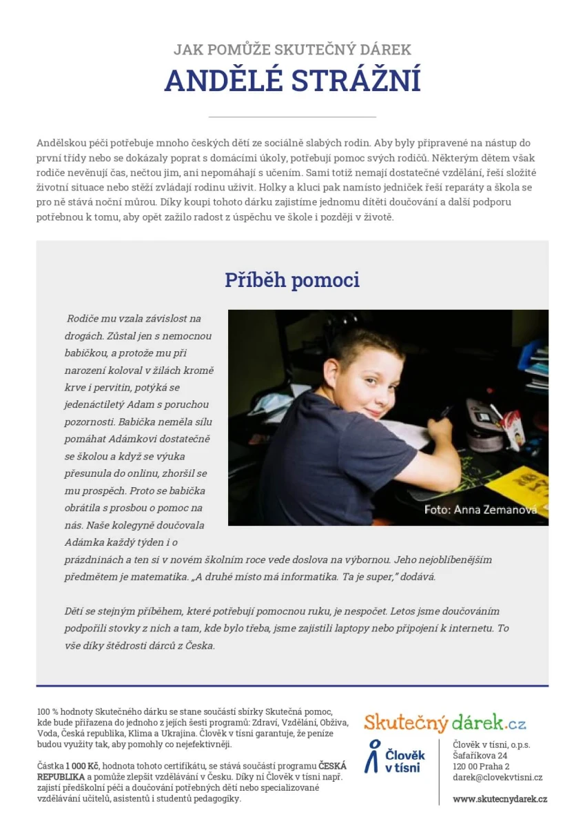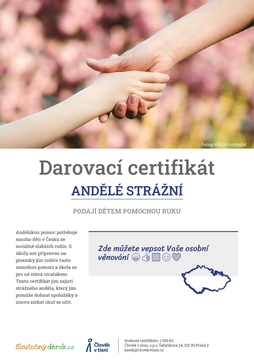 „Překážky z cest nám odklidí a víru vrátí,” zpívá se v písničce Václava Neckáře. A tuto andělskou pomoc potřebuje mnoho českých dětí ze sociálně slabých rodin. Na psaní úkolů i učení se na písemky jsou často samy, rodiče jim totiž s přípravou do školy nedokážou kvůli svému nízkému vzdělání pomoci. Kupte exkluzivní edici tohoto certifikátu a udělejte z obdarovaného, nebo ze sebe samého, strážného anděla. My díky vám zajistíme podporu ve vzdělávání pro české děti z chudých rodin.