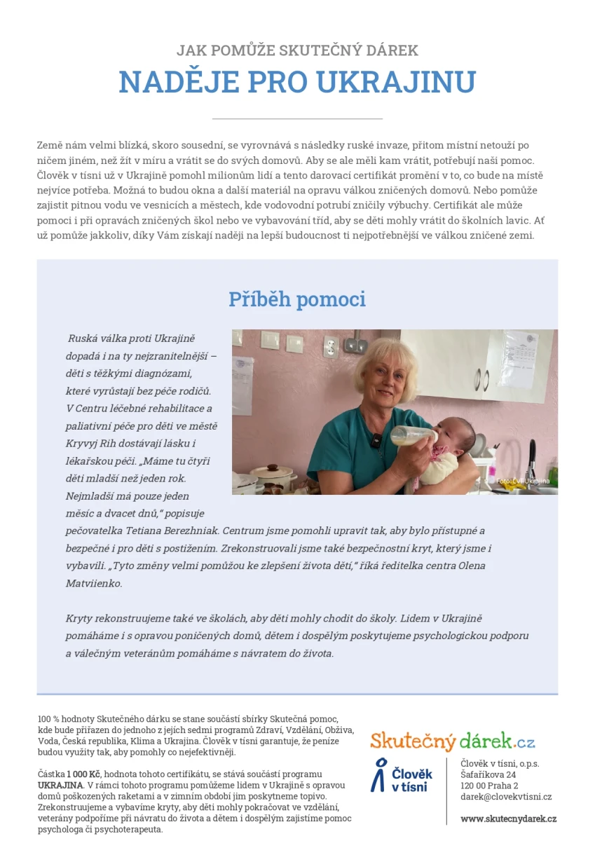 Nákupem tohoto darovacího certifikátu přispějete na programy pomoci sbírky Skutečná pomoc.