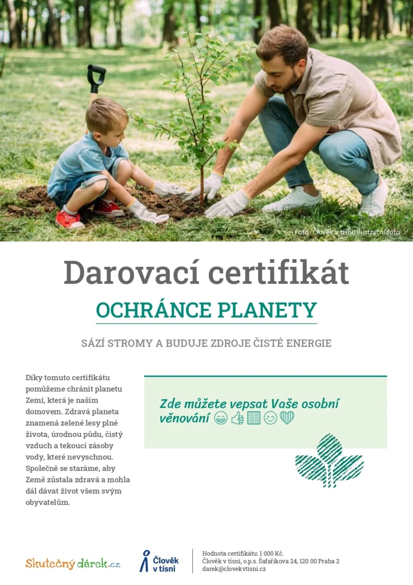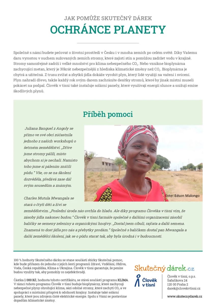 Nákupem tohoto darovacího certifikátu přispějete na program pomoci KLIMA v rámci sbírky Skutečná pomoc.
