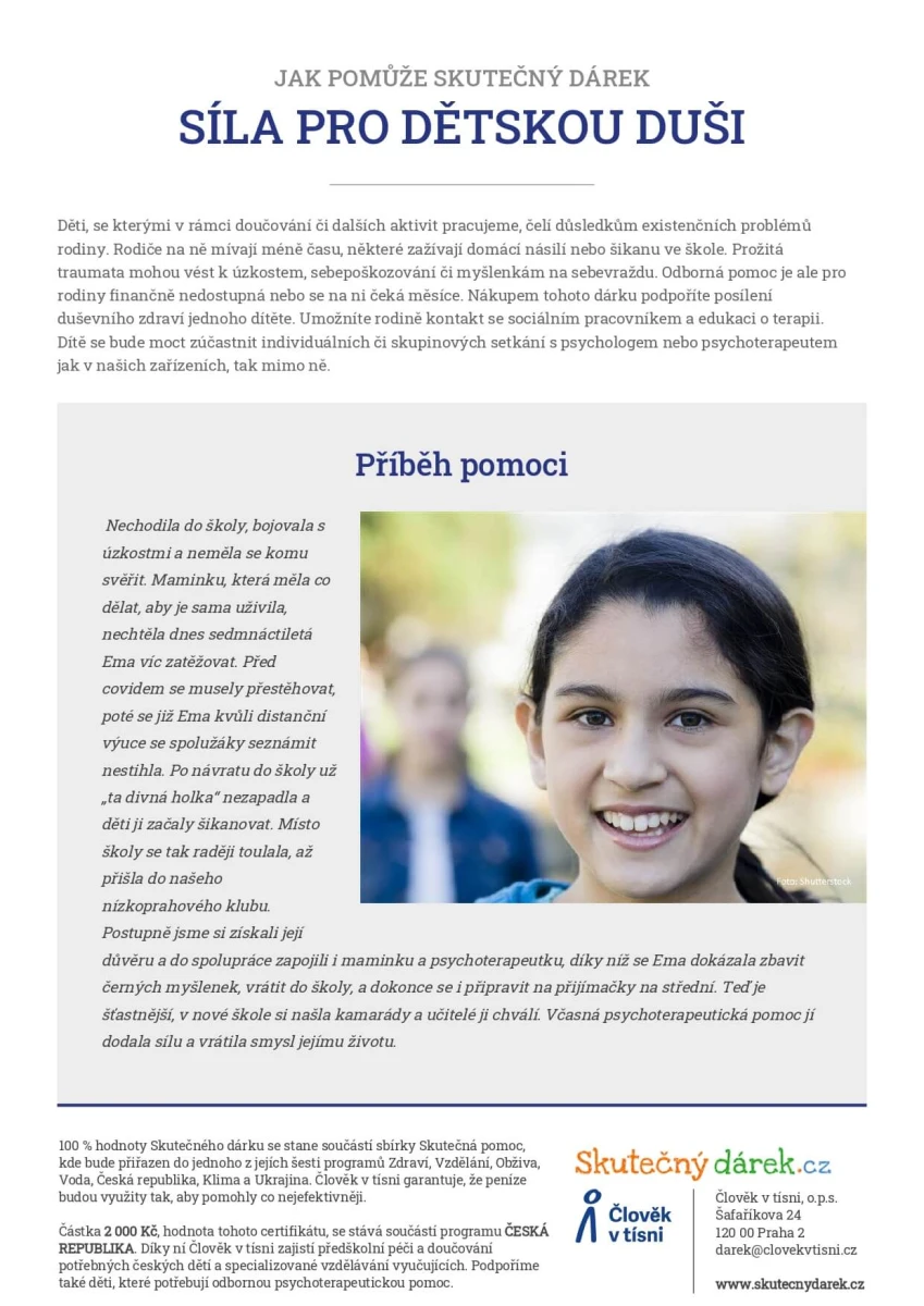 Chudoba, domácí násilí či závislosti v rodině, šikana ve škole. Mnoho dětí, se kterými pracujeme, si do života odnáší traumata. Ta mohou vést k úzkostem, depresím i myšlenkám na sebevraždu. Zakoupením tohoto darovacího certifikátu podpoříte duševní zdraví dítěte a umožníte mu přístup k odborné péči, individuálním i skupinovým setkáním s psychologem a terapeutickým sezením.