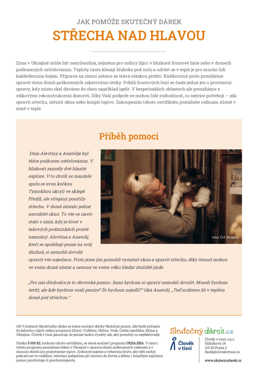Přežít zimu znamená víc než jen mít doma teplo. Znamená to mít střechu, která nepropouští sníh, okna, kterými netáhne, a místo, kam se lze schovat před větrem a mrazem. V Ukrajině však mnoho domů zůstává poškozených bombardováním. Díky darovacímu certifikátu Střecha nad hlavou si rodiny mohou opravit své domovy, pořídit izolační materiály, vyměnit okna či dveře a zajistit vytápění.