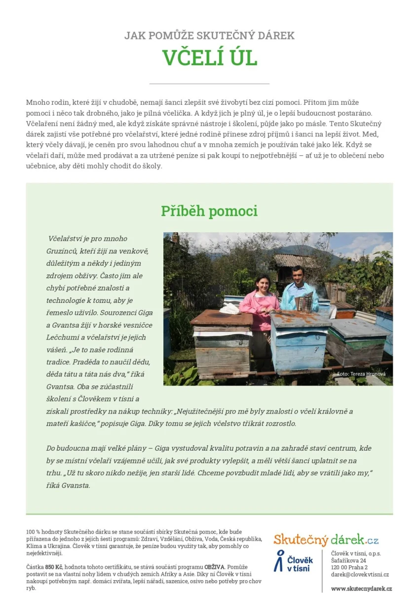 Včely, které se zabydlí v darovaném včelím úlu, přinesou dostatek medu jedné rodině na spotřebu i prodej. Med je ceněn pro svou lahodnou chuť a v mnoha zemích ho také využívají jako lék. Díky vám lidé v chudých částech světa budou mít lepší živobytí i dobré zdraví. A vy budete mít radost z toho, že na druhé straně světa létají vaše včely a pomáhají potřebným.