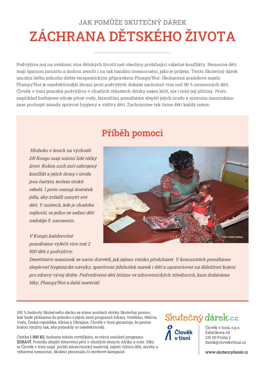 Nákupem tohoto darovacího certifikátu přispějete na program pomoci ZDRAVÍ v rámci sbírky Skutečná pomoc.